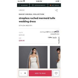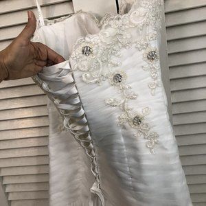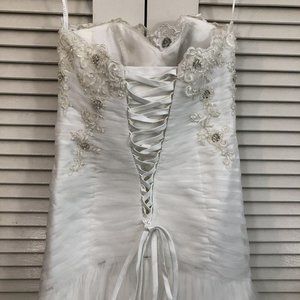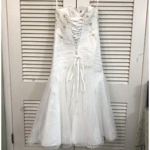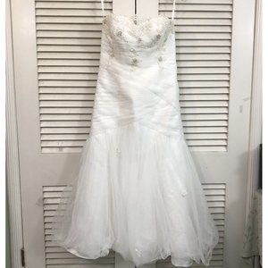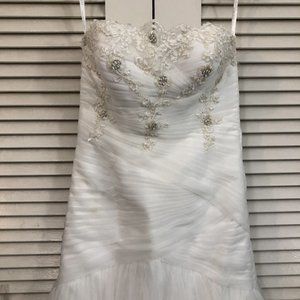 Davids bridal strapless sweetheart ruched mermaid tulle wedding dress with custom embroidery and beading detail. Corset lace up back. Size 12. Originally $499 without the custom embroidery and beating. Currently $399 online and sold out as of 7/18/22. Style number is WG 3791 in a size 12. The stock derived listing cover photo of the dress is this specific dress style WITHOUT the beading and embroidery. Please note the style number in the second photo from the online site and the style number of the dress shown on the inner tag of the dress in the last photo. Dress in very good overall condition with light signs of wear like light wear to the bottom, needs cleaning and a loose bead. Open to offers!