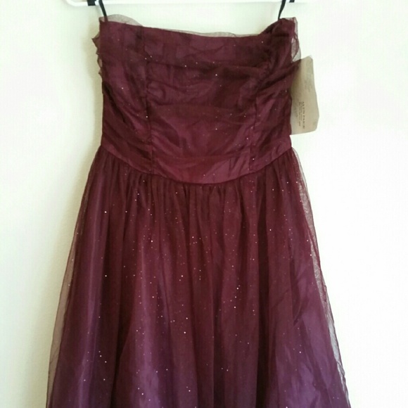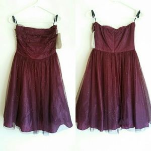 Burgundy/Covered in Glittery tulle/Ruffled top with a princess like skirt/Has a petty coat underneath