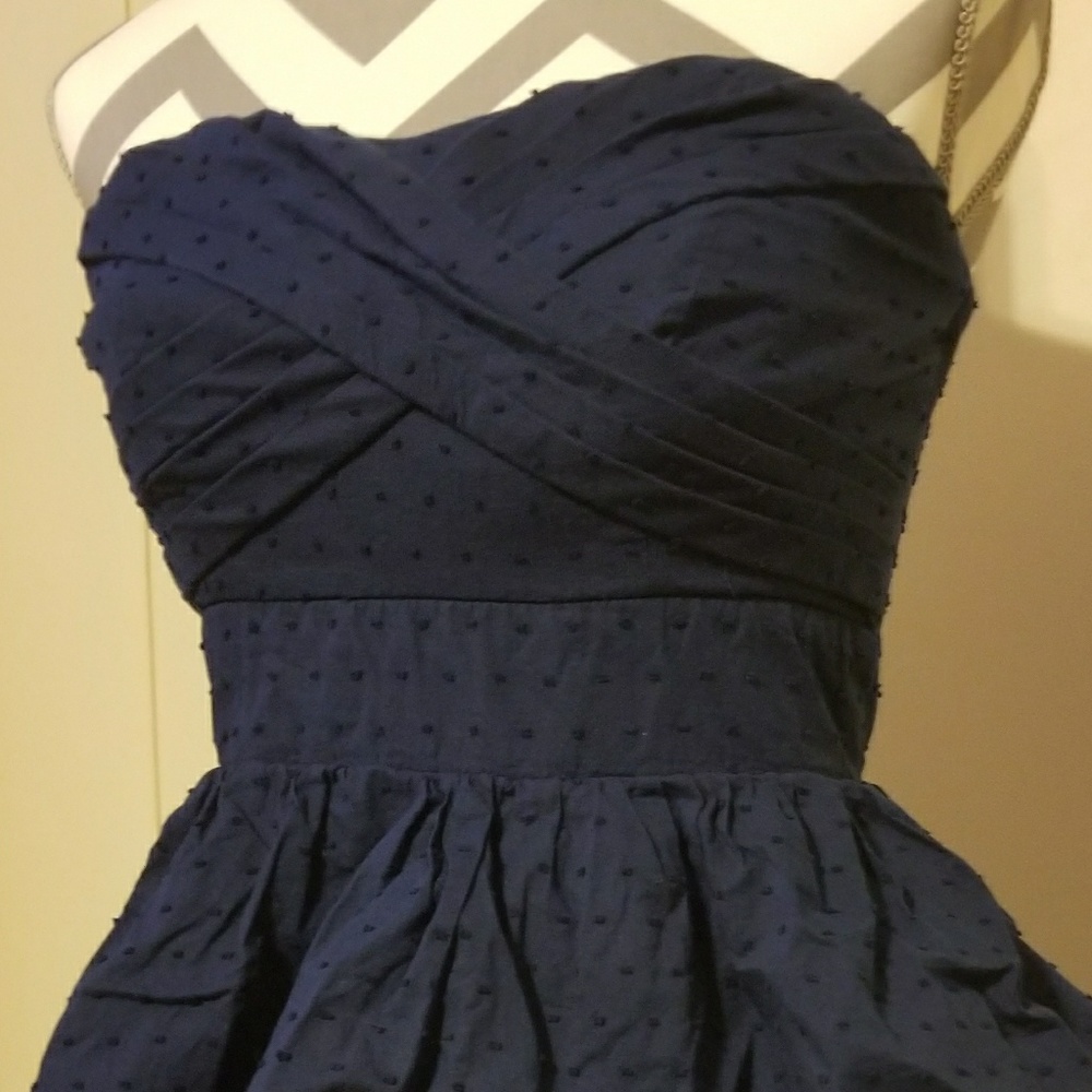 Blue Strapless ruffle dress with plastic around top to help hold it up. Looks great with a statement belt & necklace!