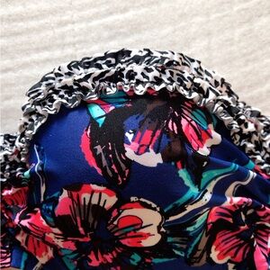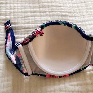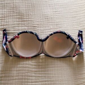 Lightly lined. Underwire. Has loops for removable straps if you want to add your own; missing original straps. Hook closure at back. No tags. Let me know if you want more pictures.