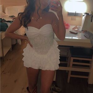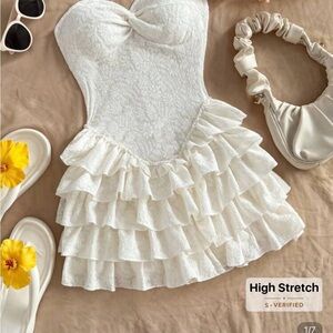 This elegant white strapless romper features a charming ruffle design, perfect for any occasion. Its classic style and comfortable fit make it a must-have addition to your wardrobe.