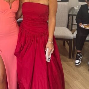 Make a statement with this strapless scarlet dress, perfect for elegant evenings.