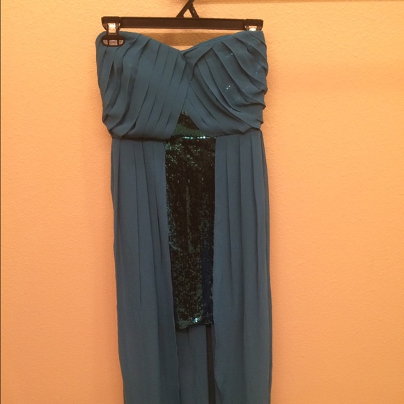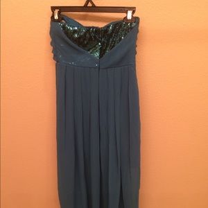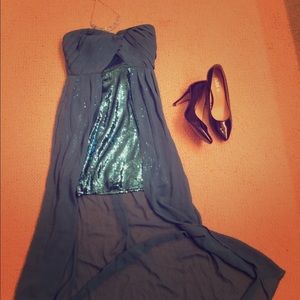 This two part dress is a lot of fun. Has a glittery sequin mini dress draped in a long, floor-length layer of chiffon. Long zipper in the back and a fastener at the top.
