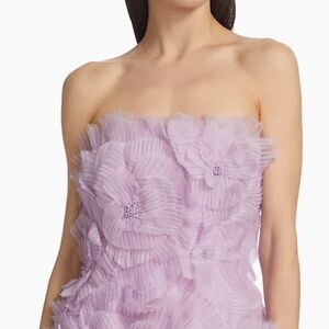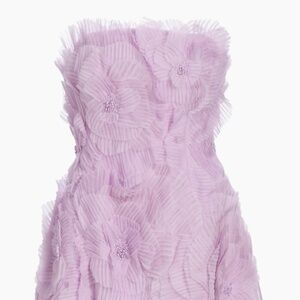 Crafted of luxurious silk, this strapless minidress from Lela Rose is decorated with bead-embroidered organza appliqués.