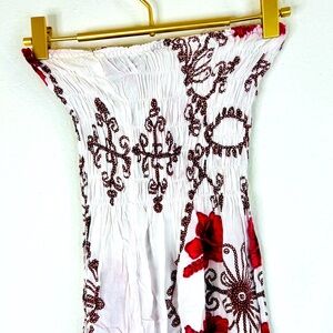 Strapless Smocked Dress White Pink Floral Boho Beach Cover-Up Small 27.5” Length