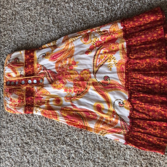 Super cute strapless Sundress with built in bra. I’m 5’3 and hits below my knees. Looks great paired with a jean jacket and gold sandals. Smoke free home.