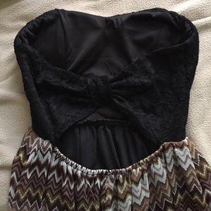 Built in padding. Lace black top. Patterned brown bottom. Tapered (short in front, longer in back)