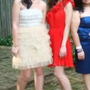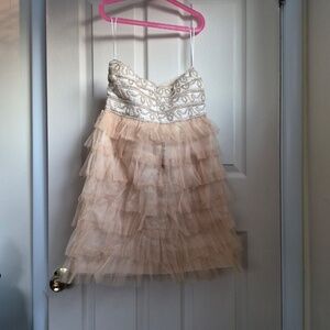 I wore this to prom over 10 years ago. I thought I’d wear it again, but never had the chance. It’s a beautiful dress that has just been sitting in my closet. I hope it finds a new home! Strapless, embroidered bustier top, multi-tier ruffle bottom, mini