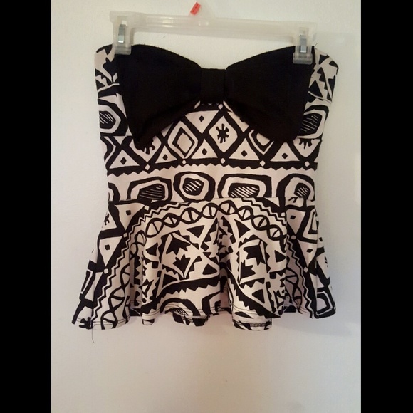 Strapless Top with Fun Design! Large Black Bow covering the chest area. Tight fitting in the middle leading to the bottom of where it flares out. Never worn!