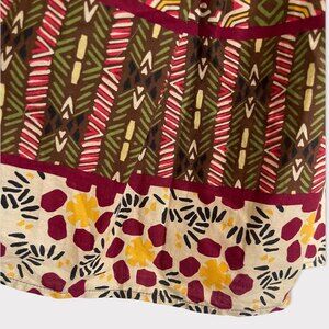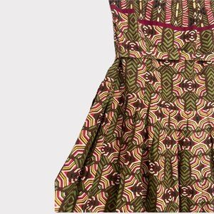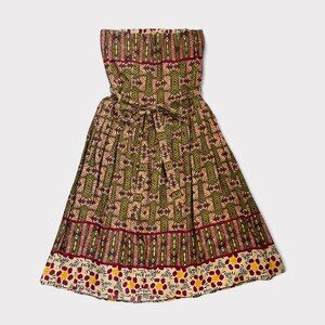 Beautiful strapless printed dress with green, brown, red & yellow patterns. Ties around waist and fits the body beautifully. Subtle pleats around waist. Lightweight and perfect for summer.