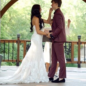 Honestly these photos don’t even do the dress justice. It’s ivory. Worn only for the ceremony. Street size is probably size 2 in the waist and 4 in the bust. I paid $3,000. It does have a bustle but I never used it since I changed dresses for the reception. It does have a corset piece that you can put in to make the torso not see through. Made by Kenneth Winston. Please ask any questions