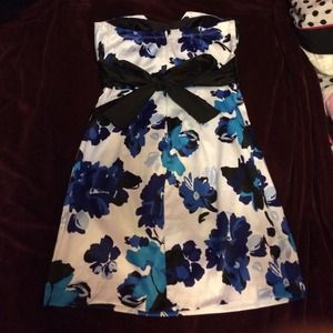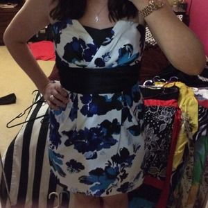 Only worn once! Too large on me now. Very nice, flower pattern dress. Pretty blues! Zipper in the back. In perfect condition! I'm 5'8" and it hits right below midthigh.