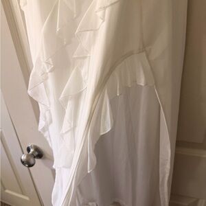stunning strapless white dress. Adorned with cascading ruffles and a slit on one leg, it's a perfect choice for any special occasion. Only worn once for bachelorette party