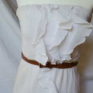 This strapless ruffle high-low Sundress is comfortable and very flattering. The strapless top has elastic and a rubbery band to hold the dress up. The ruffles at the front bodice meet a ruffle that goes down the front of the dress and flows into the ruffled hem. The braided cognac color belt with a gold buck gives the dress a nice boho-chic look. The fabric of the dress is thin tissue weight gauze with a full lining underneath.