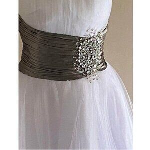 Strapless White Tulle Dress With Silver Ruched Waist & Rhinestone Accents Size12
