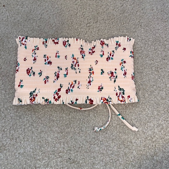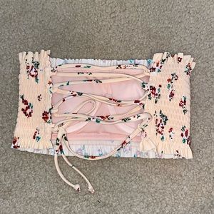 Light pink/cream colored, strapless, floral patterned, laced up back.