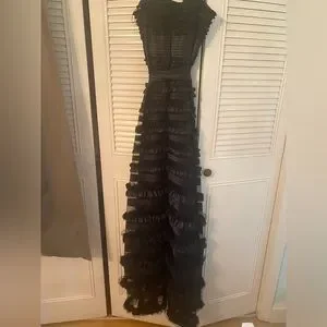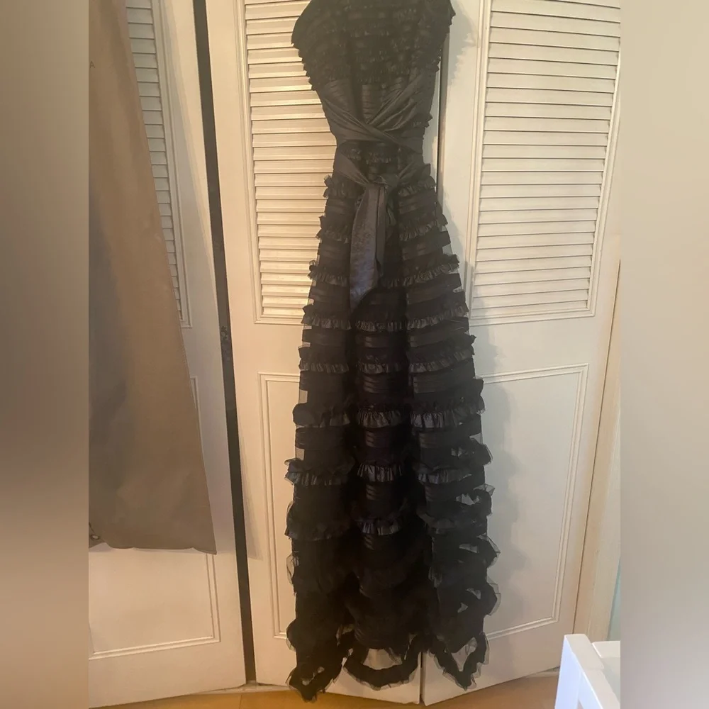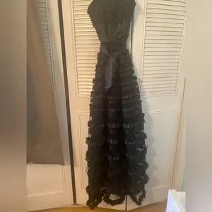 Strapless black gown with layers and tie at the waist. The top is like a corset.