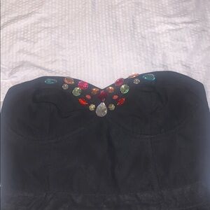Strapless black top with different colored rhinestones at the top. Super cute! Fitted upper half with a scrunched back for comfortable fit. Front part has little room for stretch. Peplum bottom half with two layers of fabric so no room for a see through top. No bra necessary! 100% polyester.