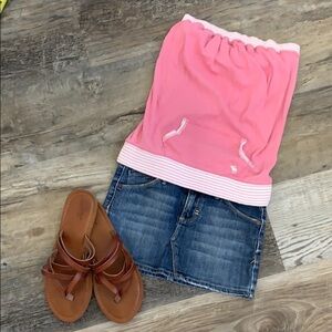 Strapless camis with pocket. Adorable moose on pocket. Distress edges on top and pocket. Jersey band across bottom.