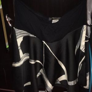 Strapless flowy cute shirt with nice design. Mandee brand. Colors are black, white and grey. Wore once. Very comfortable. Has hoops on sides to wear with a cute belt around it. Built in bra pads are included. Size medium, but could fit a range of sizes since the top is stretchy-like and also could be tightened with a belt. Could be used for casual or fancy. Goes with anything :)