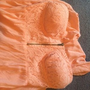 Peach with lace detailing and zipper on the top. Very pretty but I lost a lot of weight before I ever got the chance to wear it. NWOT. Built in cup bra