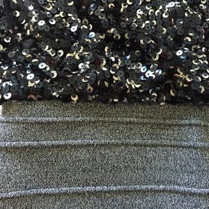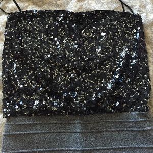 Flirty and fun-this little strapless number is perfect if you want to turn heads. Black and silver sequins on top, and a form fitted silver threaded bottom. The top is loose fitting and extremely flattering.