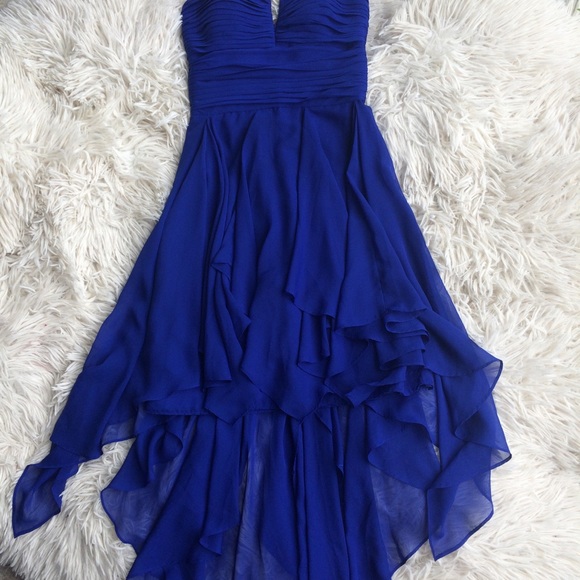 Wow!!! This dress is stunning! A beautiful deep sapphire blue that is short in he front and king in the back. Multiple layers for that beautiful mermaid feel. Strapless and hand made 💜 size 0
