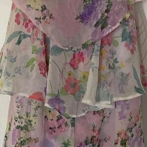 Flirty tiered wide leg jumpsuit in multi floral print, lightweight, romantic