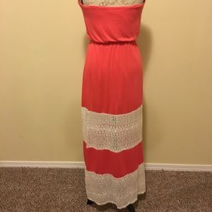 This strapless maxi-dress comes in a vibrant coral color, has an inner liner, and a sash tie.