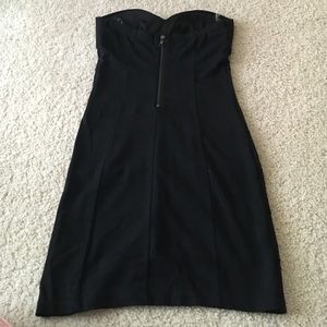 Black strapless bodycon mini dress. Sweetheart neckline. Polyester/spandex. Hits upper thigh. Unlined. Back half zipper.