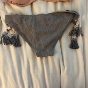 Strapless top- size 8, but can fit smaller. Tassel bottoms- size 4.
