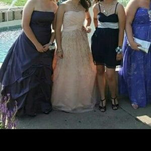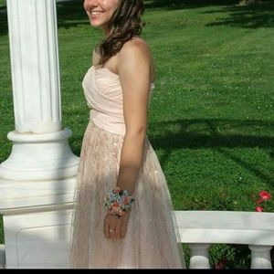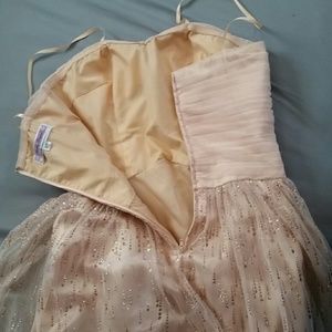 Gorgeous, full length, strapless prom gown. Only worn once, and you can't even tell! The bottom hem of the dress has a few marks and very little wear, but it isn't noticeable because it is on the ground and covered up by the top material. Gold sparkles run down the length of the dress and you'll feel absolutely beautiful in this, I promise!