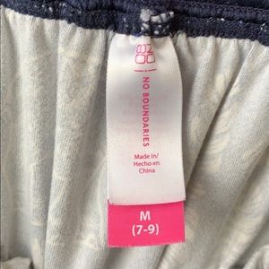 Navy blue and white with elephant prints. Elastic on top and in mid section, contains pockets.