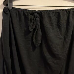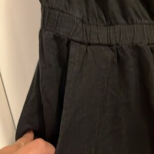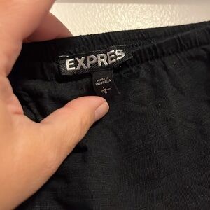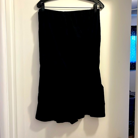 Express strapless black romper with cute tie detail in front. Has pockets! Can be dressed up or down.