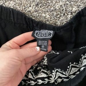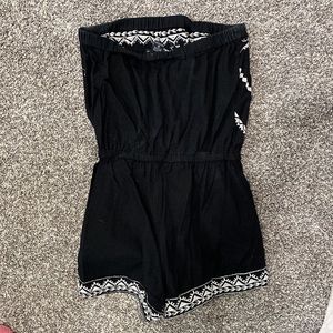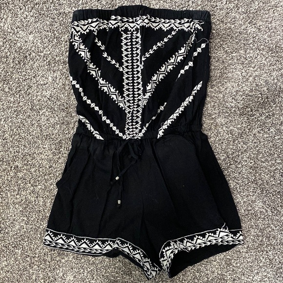 Lightly worn. Has pockets. Loved this romper, and ready for something new. Elastic around the top keeps it up really well. It can get twisted inside, but is easy to flatten out. Super cute and trendy!