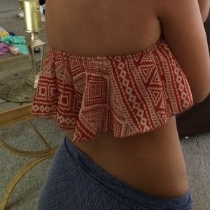 Burnt orange and Creme ruffled crop top. Size M but would fit a small or medium. Bought in college but never got around to wearing it. See also other Tobi, Nasty Gal, Lulus, ASOS, Forever 21 listings