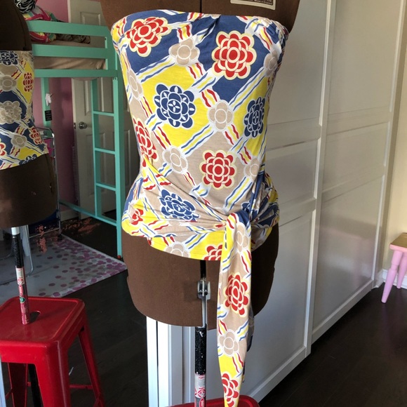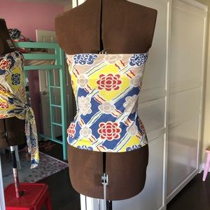 😎 strapless top with geometric pattern. Very eye catching. Built in shelf bra and ties and low waist. Fabulous top with white pants or jeans.