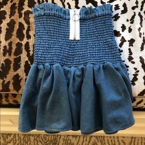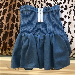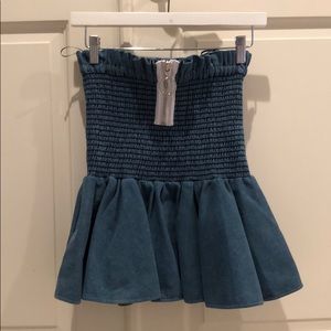 It is denim color blue. Strapless neckline. Tube and peplum at bottom. It is fairly new and in great condition