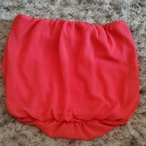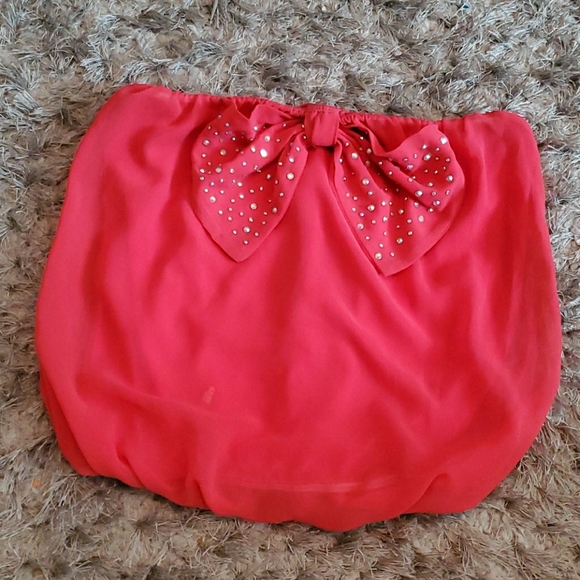 Coral strapless top with bow in front. Bow has rhinestones on it. Elastic on top and bottom
