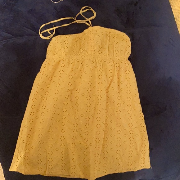 Banana yellow crochet-style tube top with tie straps at neck. Fully lined. Top fits long.