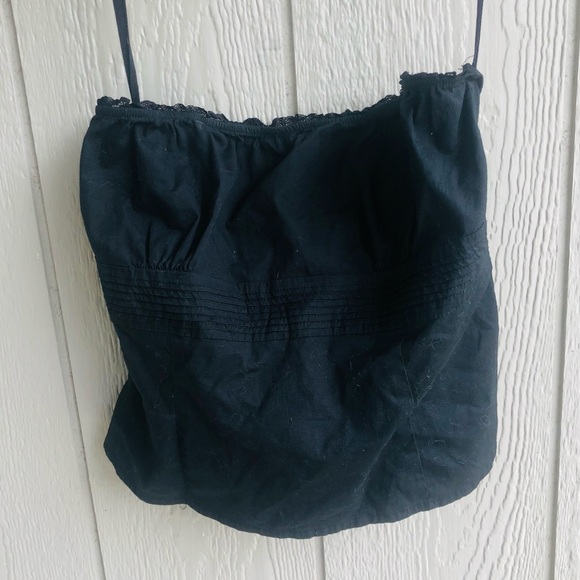Cute strapless top with lace and pleated details! Elastic at the top which is in excellent condition, with fine lace at the top. Pleating detail in the mid-section, with darts all the way around for a snug fit. Back zip closure. No fading.
