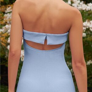 Perfect for wedding season this dress is comfortably yet elegant for all your formal events. Strapless, sleeveless, off-shoulder, low back with a folded stretchy band, solid color, ankle length, hem split, slim fit, bodycon dress.