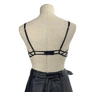Bralette in Black polyester spandex with dual strap detail on the shoulders and at the neckline and criss-cross strap detail at the sides. Adjustable hook and eye closure. Perfect under a sheer top or by itself!