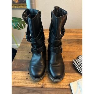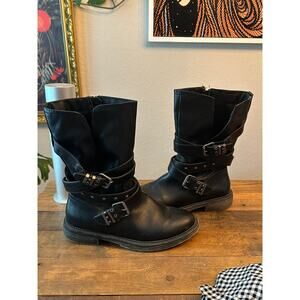 Toughen up your look with these edgy strappy combat boots in black faux leather from Kohl’s (KatsuraBlack). Features a mid-calf height, stacked low heel, and triple buckle strap details for an industrial moto-inspired vibe. Side zip entry makes them easy to slip on and off. Women’s size 9 Medium. The perfect alt staple to pair with ripped jeans, mini skirts, or oversized tees.