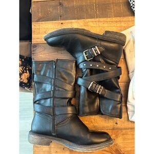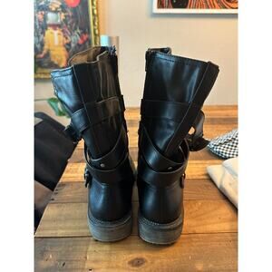 black combat boots, buckle moto boots, strappy mid-calf boots, faux leather boots, edgy streetwear shoes, alt girl boots, grunge footwear, Kohl’s boots, KatsuraBlack boots, women’s size 9 boots, utility fashion, steve madden