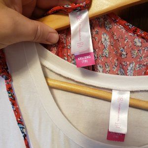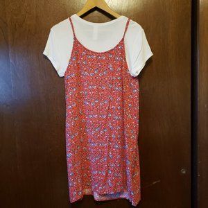 Red dress with blue and white floral print and white t-shirt