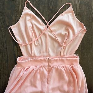 Very, very pretty maxi dress. Great as a wedding guest, for a special event or a date night. The back is open all the way down to the zipper, with only the straps that cross-cross over top. The straps are not adjustable (so I just used a bunch of tape to make it stay in place). It’s a really pretty ballet-pink, creamy-salmon, light coral-pink kinda color that I seem to be struggling to describe in one word. It’s lined underneath with a soft fabric and then over there is a lovely sheer material. There are some flaws though, which I tried to account for in the price but can be flexible. I did wash it after wearing, but that was several years ago. I’m going to try washing again but it may still need it dry-cleaning (I’ll update listing if the scuff marks come out). The dress is full-length and I did not have it altered, so there unfortunately are scuff marks throughout the very bottom. There are a couple threads that I’m too scared to trim (next to zipper) and one piling spot on the front. Most of it isn’t noticeable unless looking directly at those areas and it’s still in adequate condition to wear out.