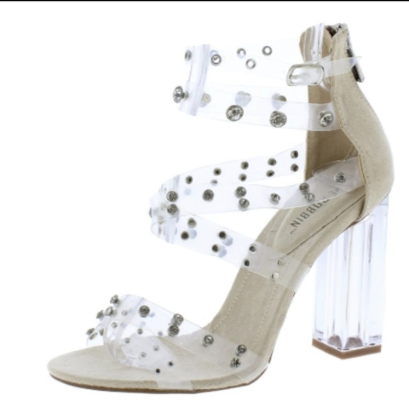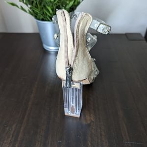Nude Faux Suede Clear Straps Strappy Cage Styling Rhinestone and Stud Detailing - Clear Lucite Block Heel Approx 4" Back Zipper