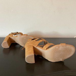 Faux suede sandals with block heel and western-style buckles. In excellent condition as I only wore these once - sadly they're just too big on me. There is no listed size, but they fit like a 9.5 and have a 3.5" heel. These zip up the back so buckles are not actually functional. Super comfortable and easy to wear thanks to the chunky heel.