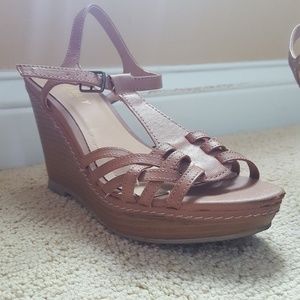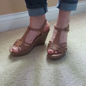These warm weather sandals are easy to walk in and feature a woven design near the toes. Slightly worn buckle area.